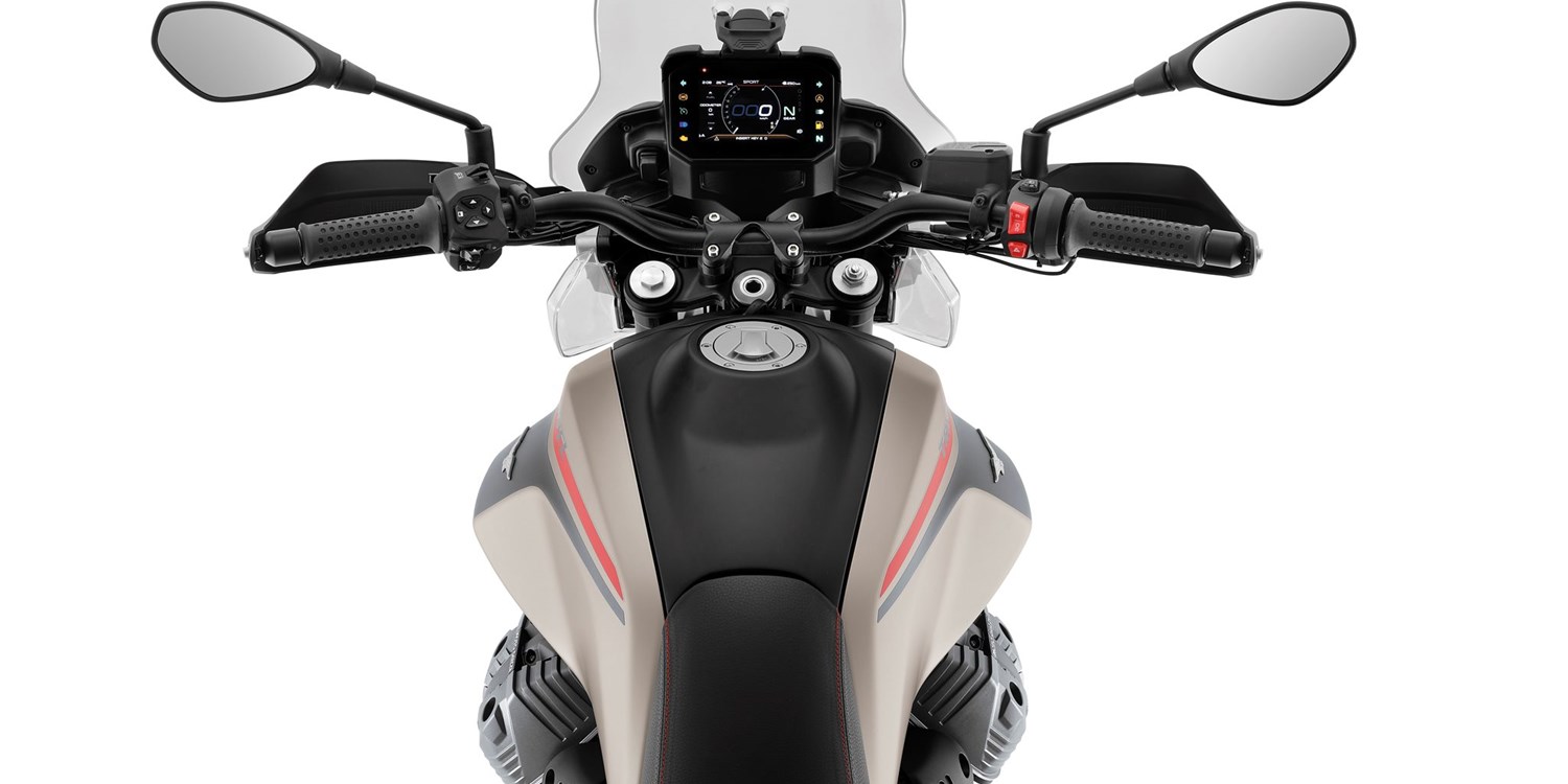 Die Moto Guzzi V85 TT Travel ist mit einer 6-achsigen Trägheitsplattform mit Kurven-ABS und Tempomat ausgestattet. Das Multimediasystem Moto Guzzi MIA verbindet dein Smartphone mit dem Motorrad verbindet und erweitert die Funktionen der Instrumententafel. Es aktiviert auch den Custom-Fahrmodus, der Road, Sport, Rain und Offroad um eine fünfte Option ergänzt. Dieser Modus ist nur bei der V85 TT Travel serienmäßig und ermöglicht die Einstellung von Leistungsabgabe, Traktionskontrolle und ABS.